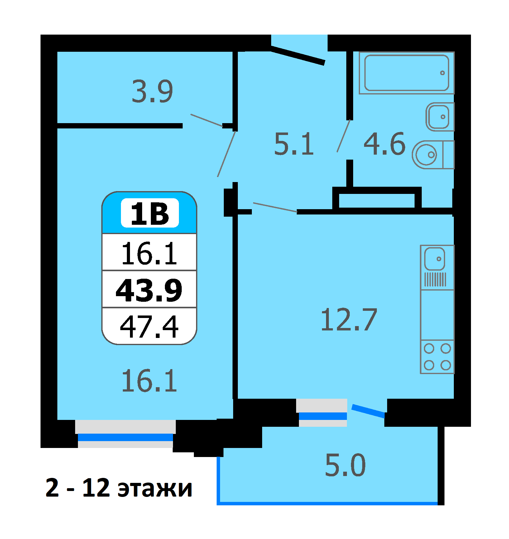 Площадь от 43.9 м2